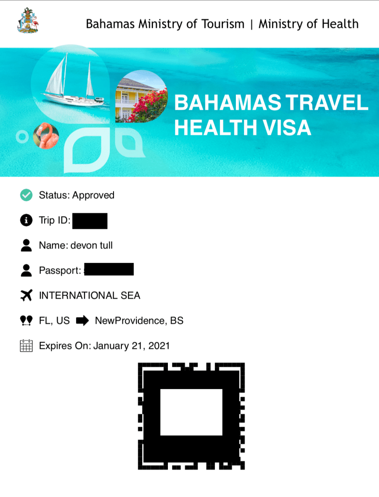 ANYONE entering Bahamian waters is required to undergo a PCR Covid-19 test (I used Lab Doctor current rate $179.00 USD) within 5 days before entering the country. Those results should then be uploaded and applied for travel visa and “Covid Insurance” ($60) accessible at: travel.gov.bs You’ll re required to upload passport and travel information as well as trip dates and destination, all typical of the classic bahamas entry forms. Cruising permits for vessels 35′ – 100′ are now $600 USD.