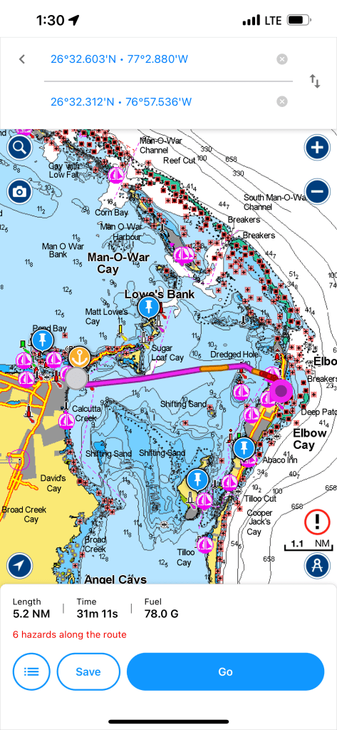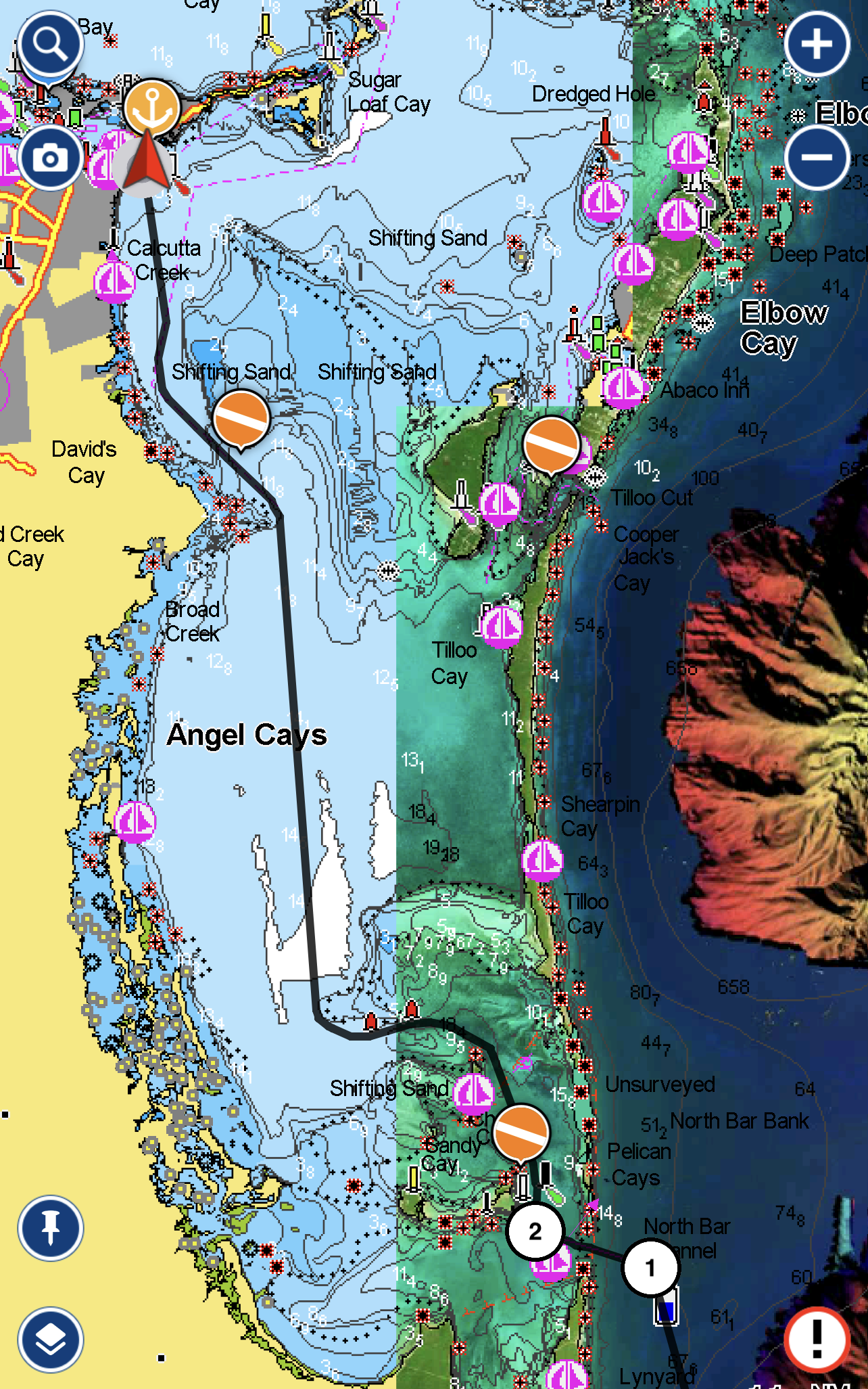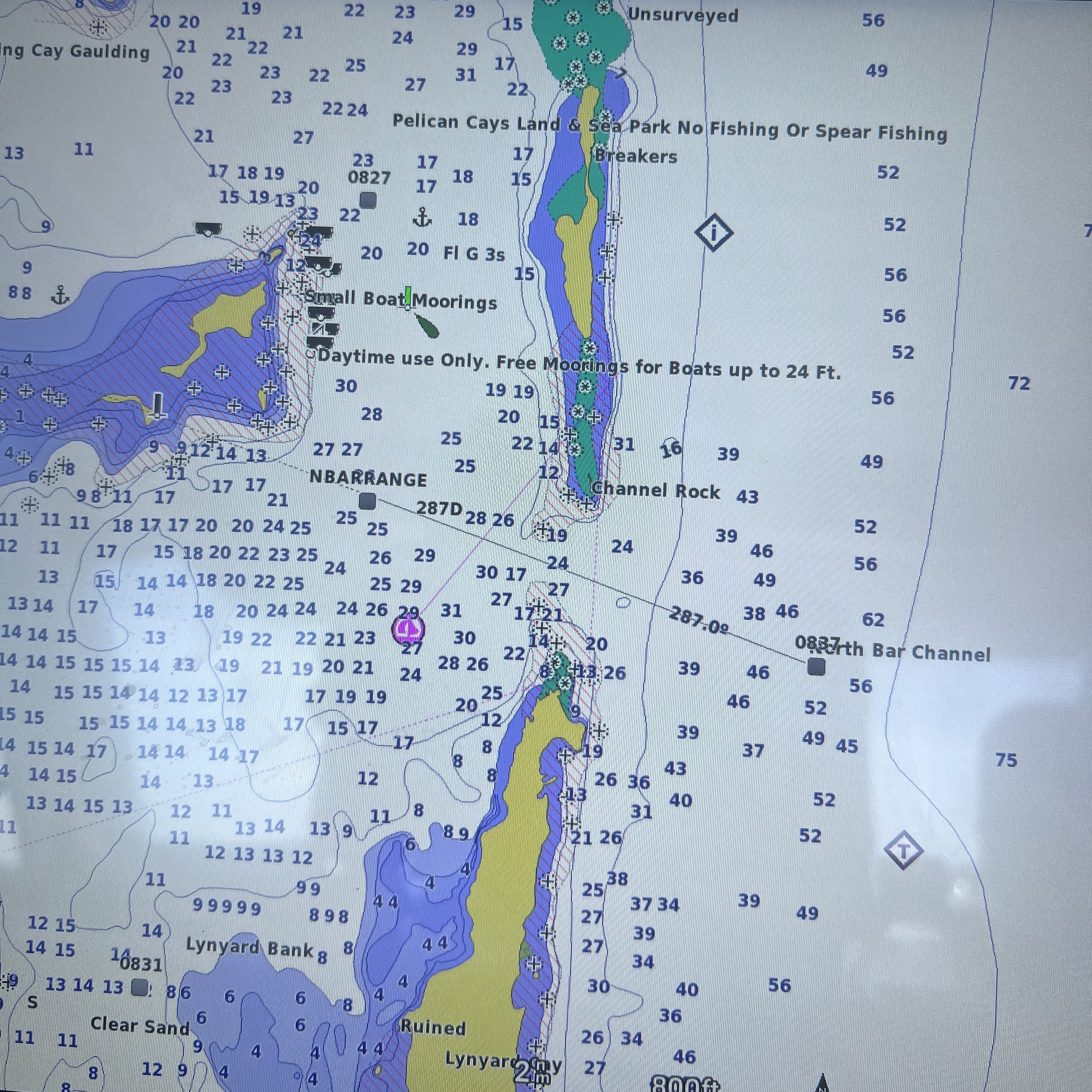 We approach the sea of Abaco from seaward via “North Bar Channel” with a 2 meter rolling Easterly swell on the stern and 30+ ft Under keel clearance.