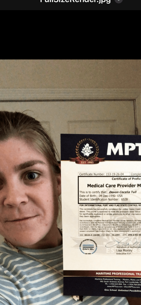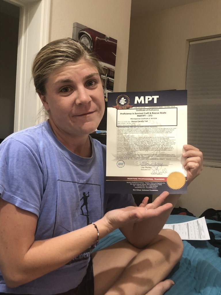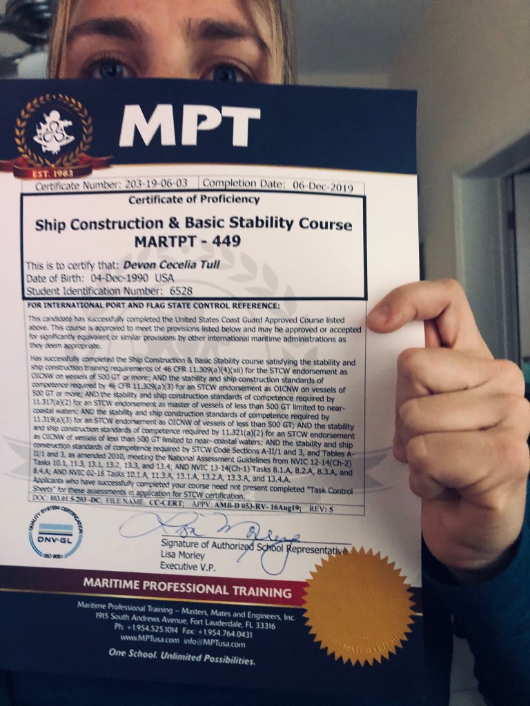 I’d enroll in classes here and there, whenever I had a stint of downtime between yacht trips, or if my schedule aligned with the next-needed course on my list. This slow process took me a whopping 5 years (including a “quarter-life retirement” roadtrip hiatus, circa 2020-2021) to complete the OICNW OFFICER IN CHARGE OF NAVIGATIONAL WATCH. (It is equivalent to a 4-year process at any maritime academy).